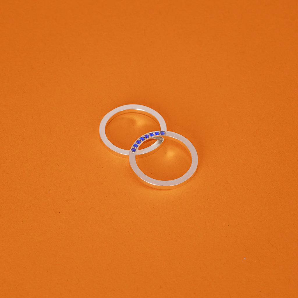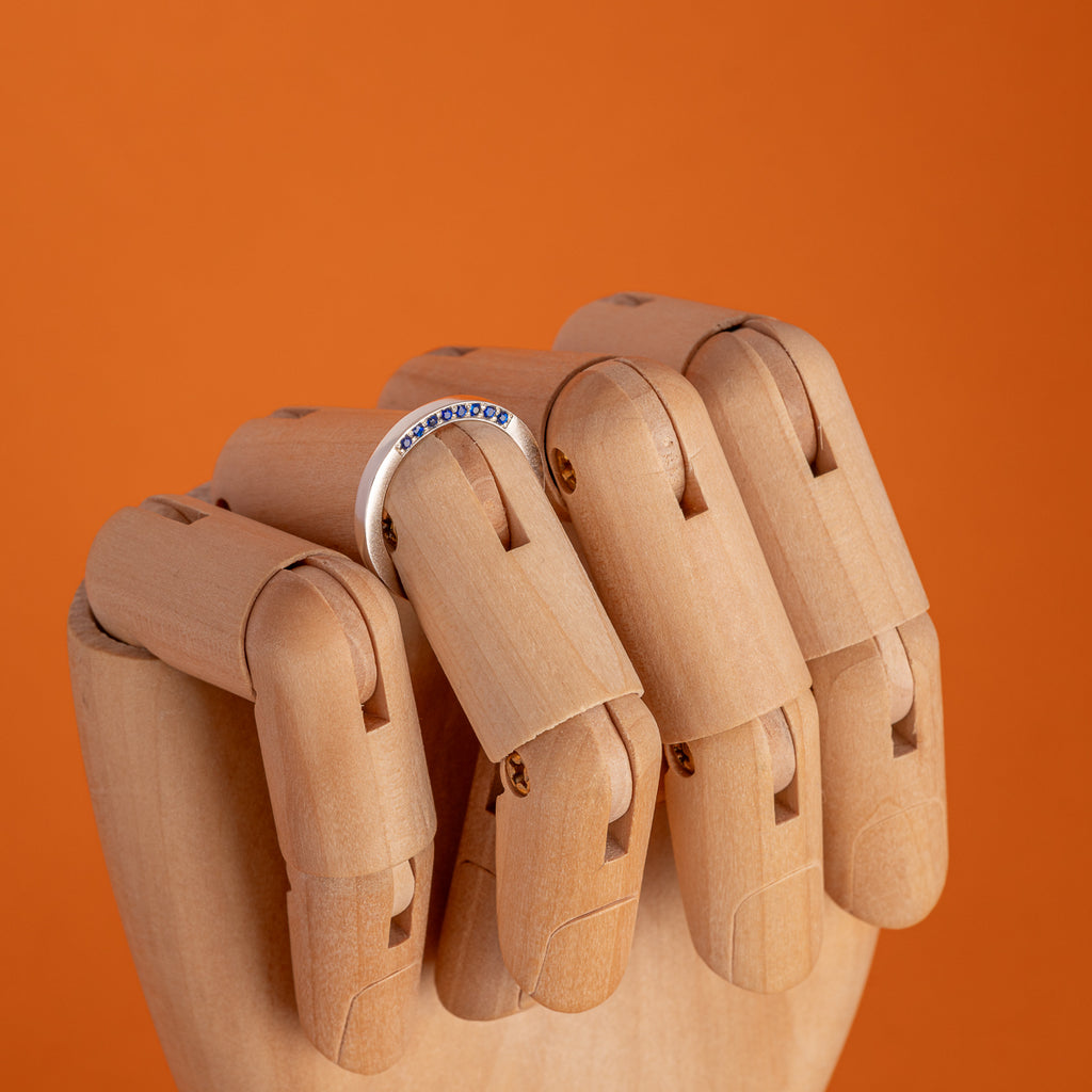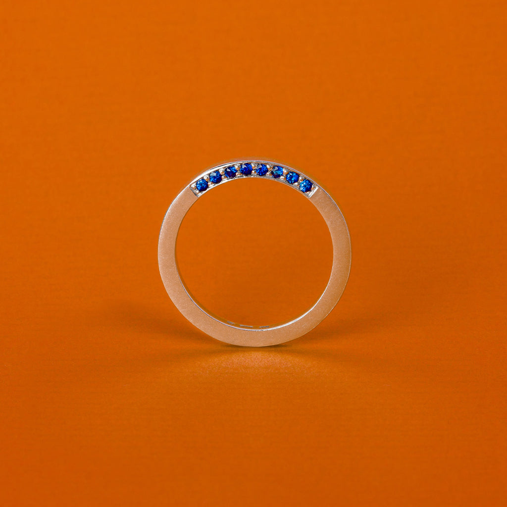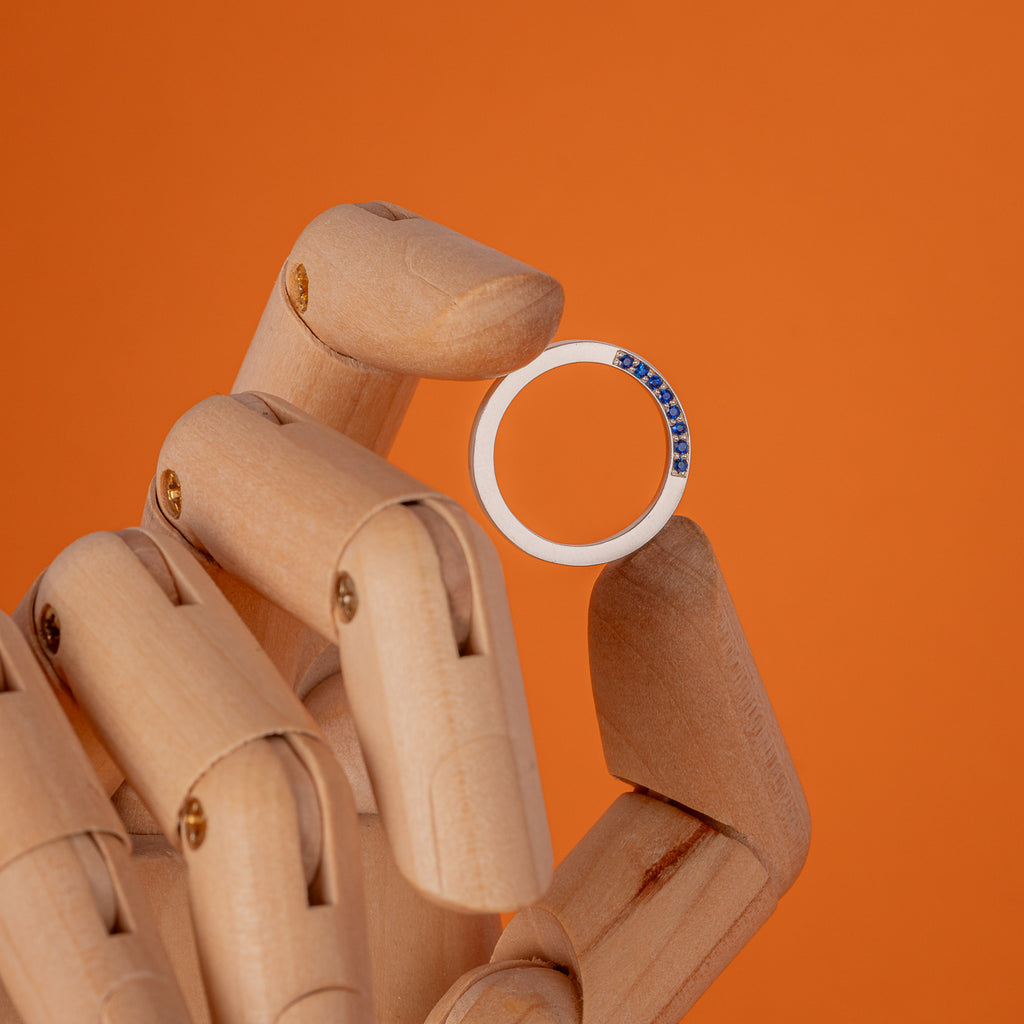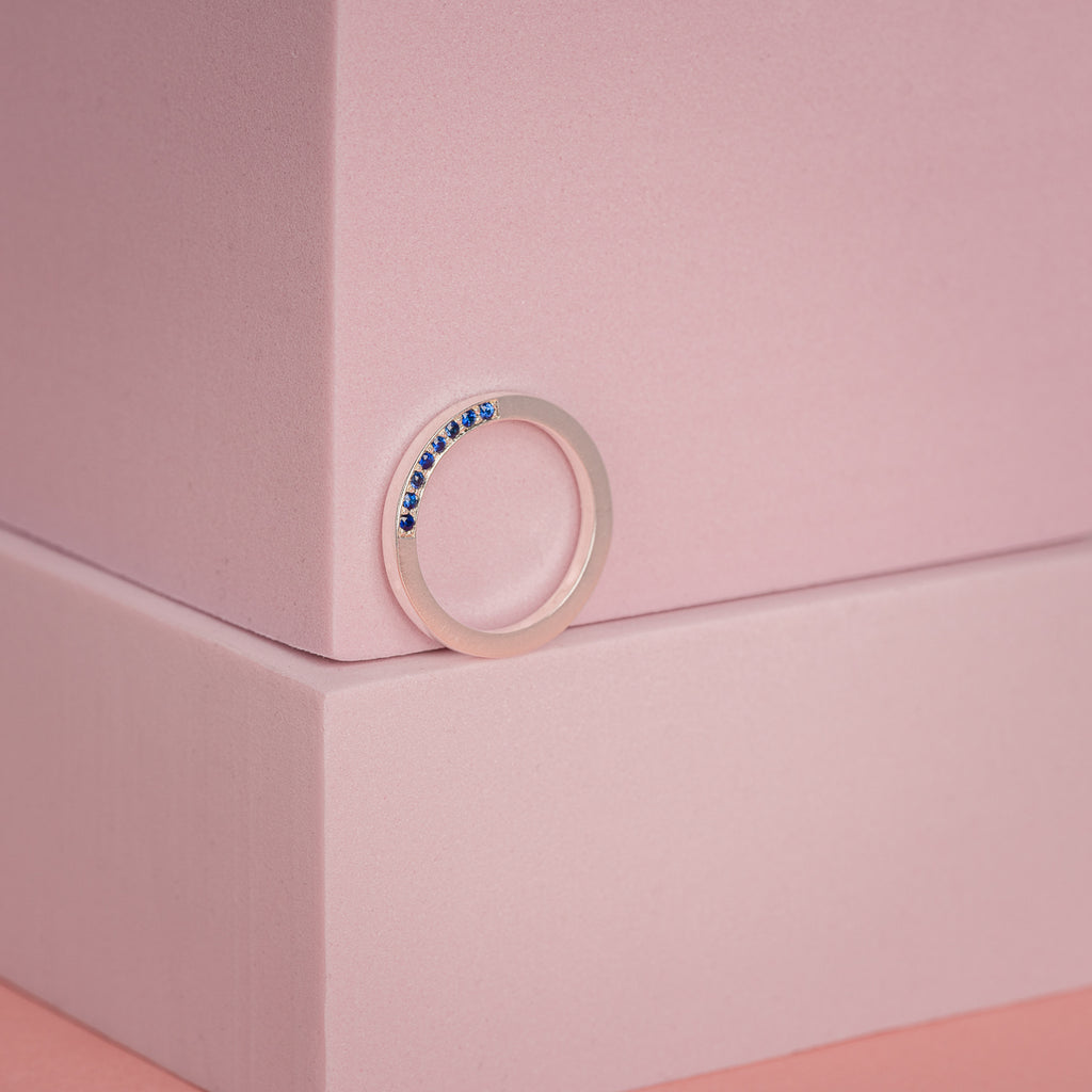 Az Enigma kollekció részeként készült gyűrű, finoman csillogó kék zafírokkal díszítve. Különlegessége, hogy a kövek a megszokottól eltérően a gyűrű oldalába vannak foglalva, kizárólag az egyik oldalon elhelyezve, így csillogásuk csak bizonyos szögekből válik láthatóvá. Letisztult formavilága a visszafogott eleganciát és a rejtett részletek szépségét emeli ki.