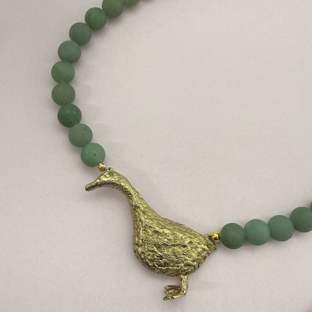 Rövid gyöngysor sárgarézből készült, aranyozott libát formázó medállal és nagyméretű aranyozott kapoccsal.