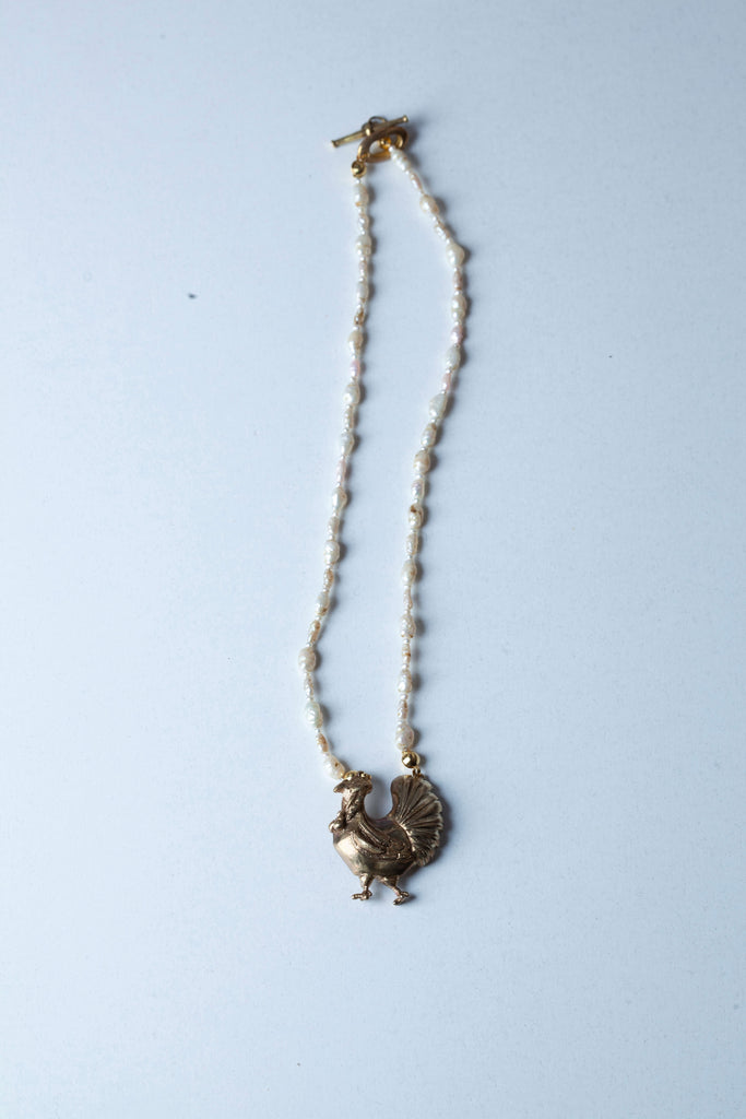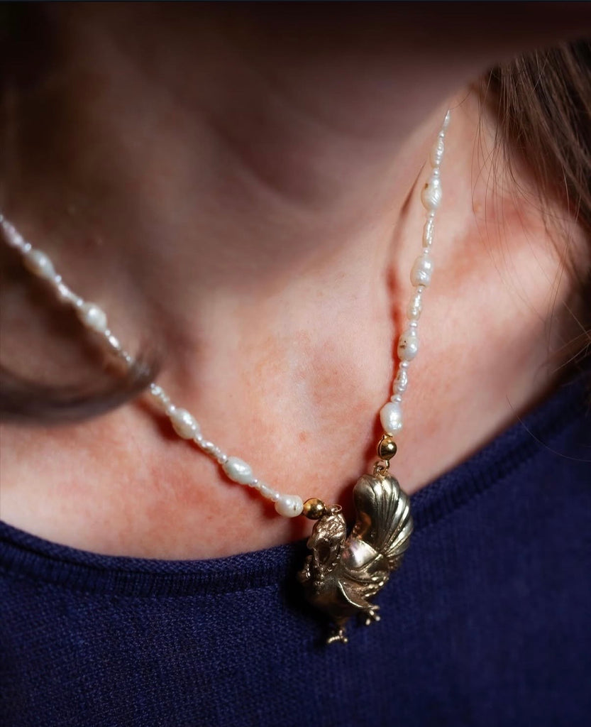 Rövid tenyésztett édesvízi gyöngysor sárgarézből készült, aranyozott pulykát formázó medállal és nagyméretű aranyozott kapoccsal.