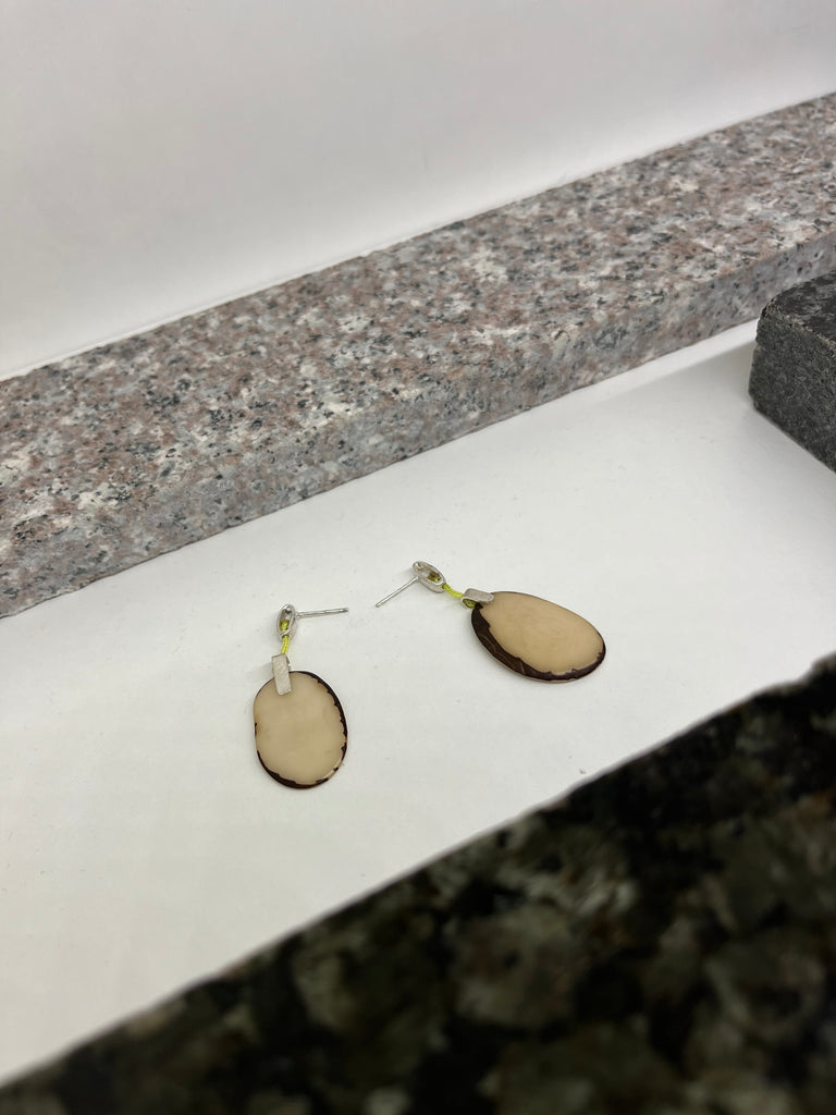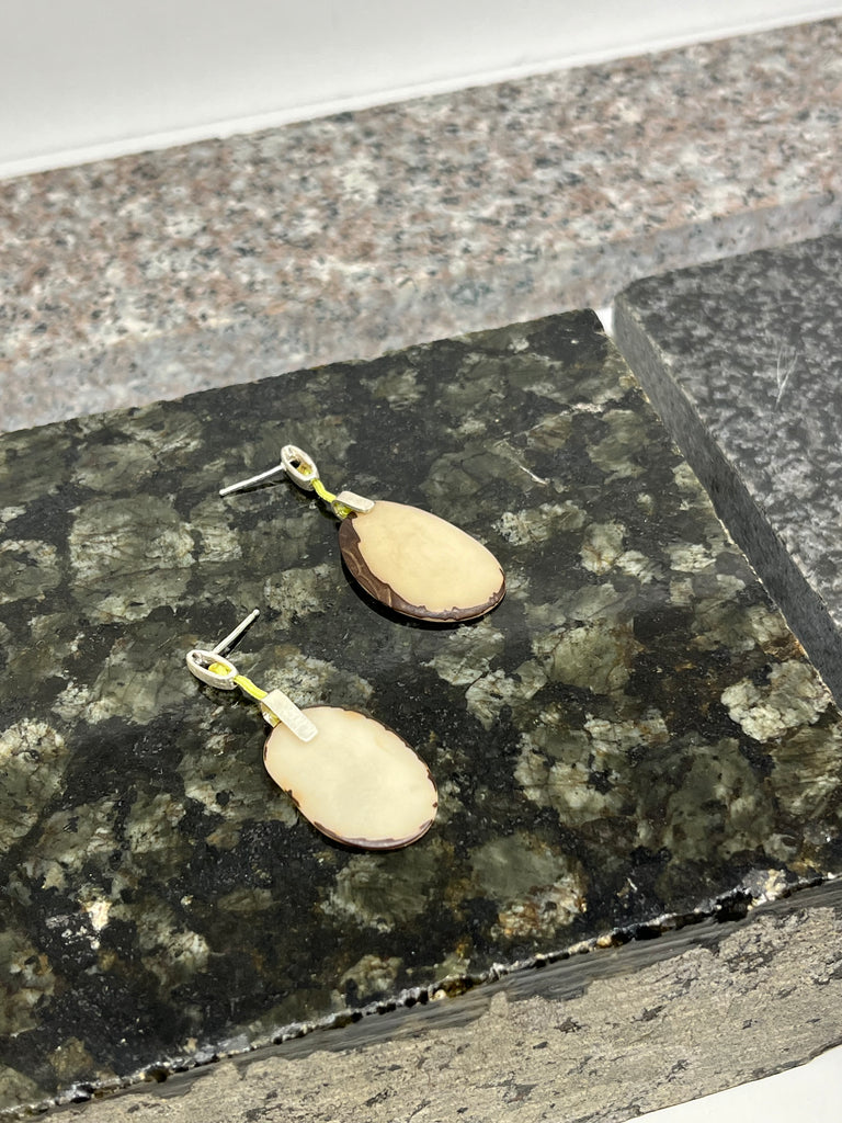 Ezüst fülbevaló csiszolt trópusi mag függőkkel.